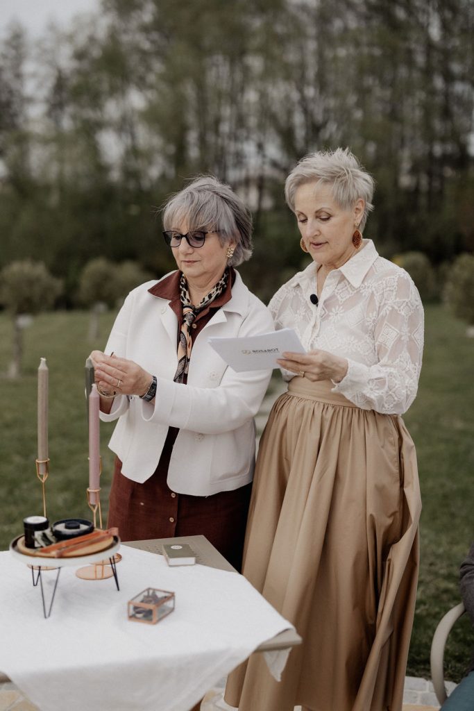 Während der feine Rauch langsam beginnt aufzusteigen, konnten die Gäste – ganz still, jeder für sich – gute Wünsche und liebe Gedanken formulieren, die sie Terese und Luca für ihr gemeinsames Leben mitgeben wollten. Leicht und frei trug der Wind dieses Zeichen der Verbundenheit in den Himmel hinauf.