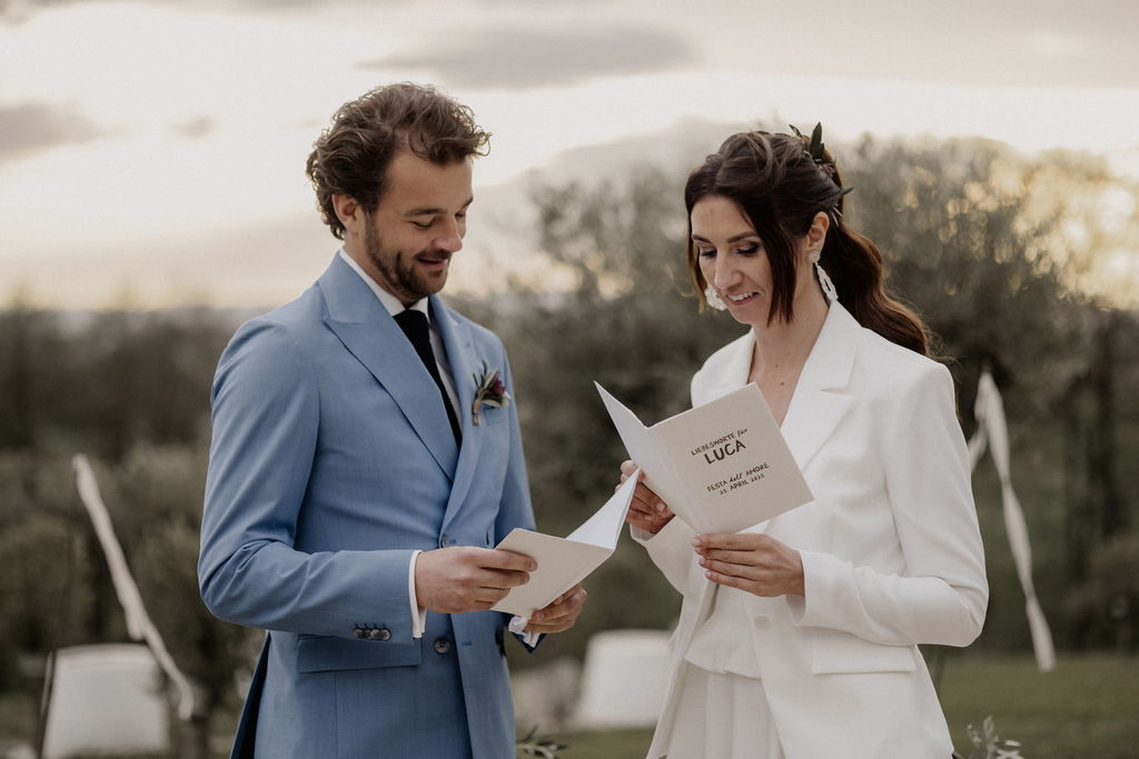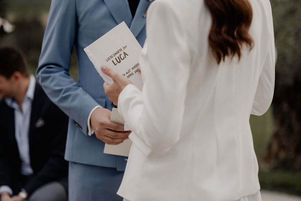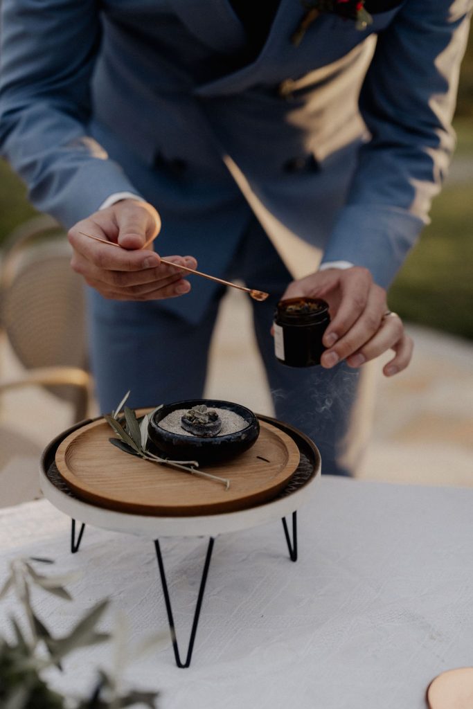 Bei dieser Trauung hat sich das Paar ein Räucherritual gewünscht. Dabei haben Terese und Luca eine feine Mischung aus Kräutern und Olivenblättern entzündet – sie stehen für Liebe, Vertrauen, Zusammenhalt und Frieden.