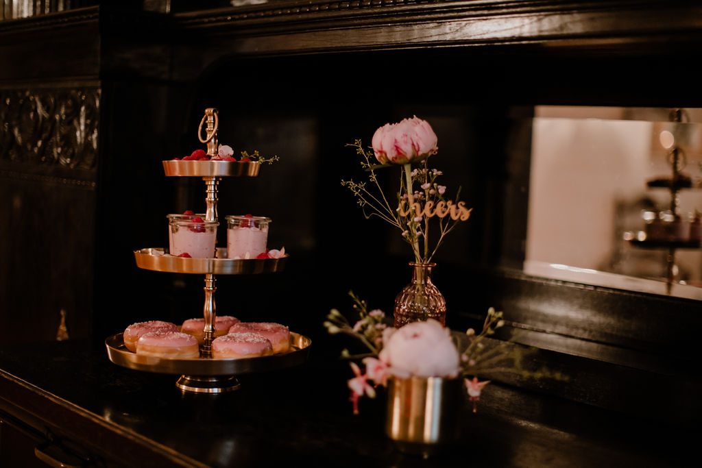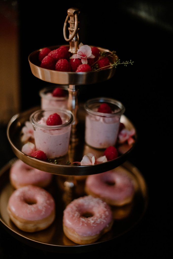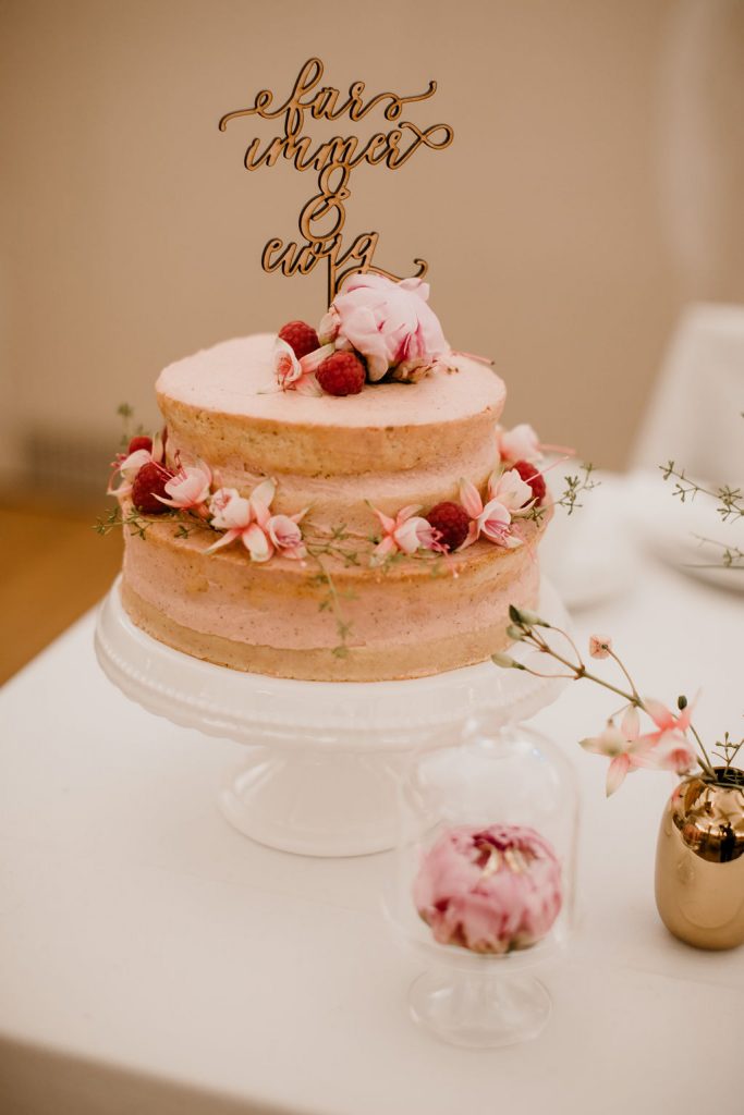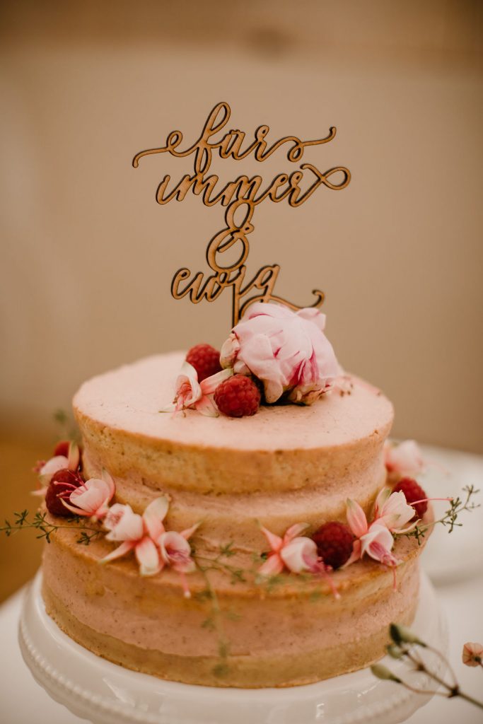Natürlich darf an solch einer Tafel ein angesagter Naked Cake nicht fehlen. Ich habe ihn mit Blüten und Himbeeren aufgepeppt und obendrauf einen Lasercut-Topper als Blickfang gesetzt. Andere, süße Glücklichmacher warten nur darauf vernascht zu werden.