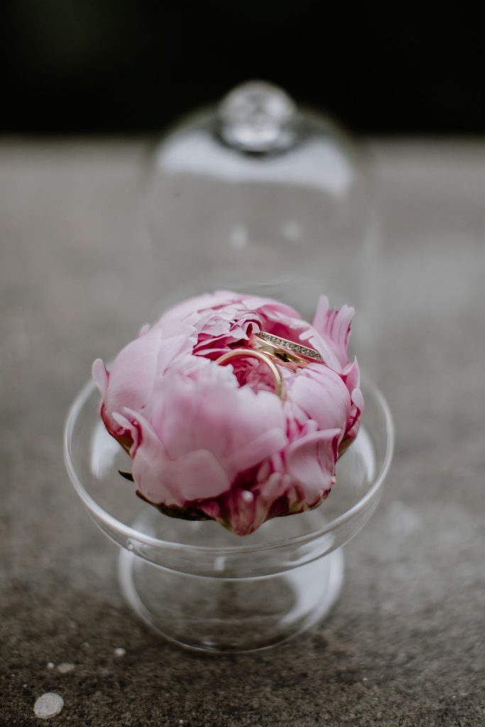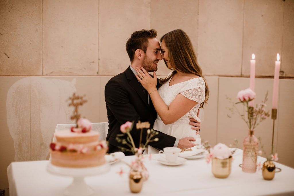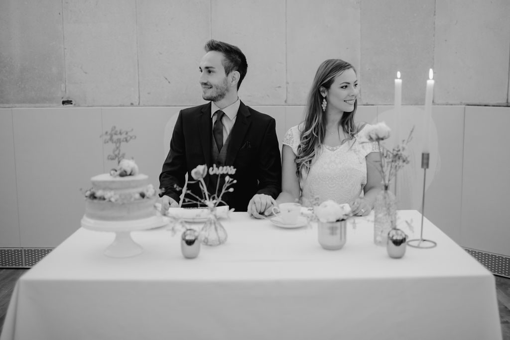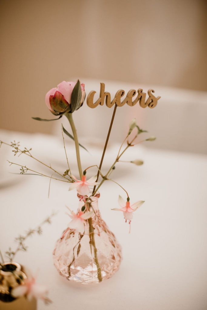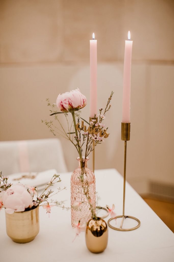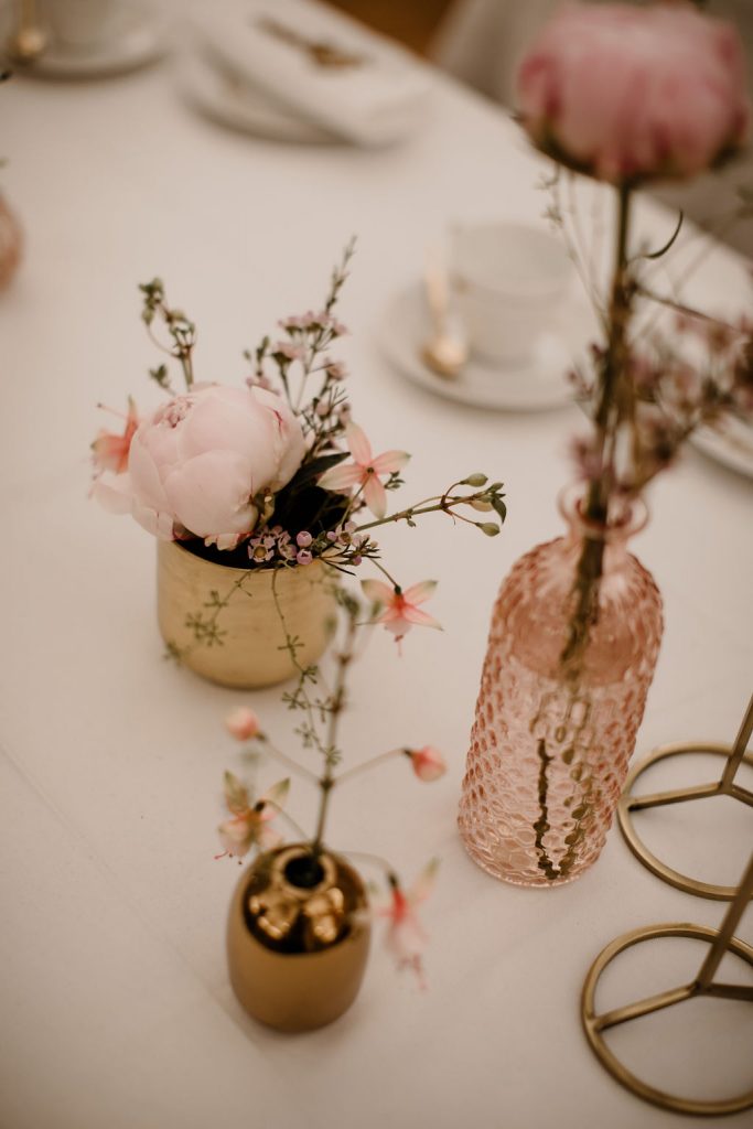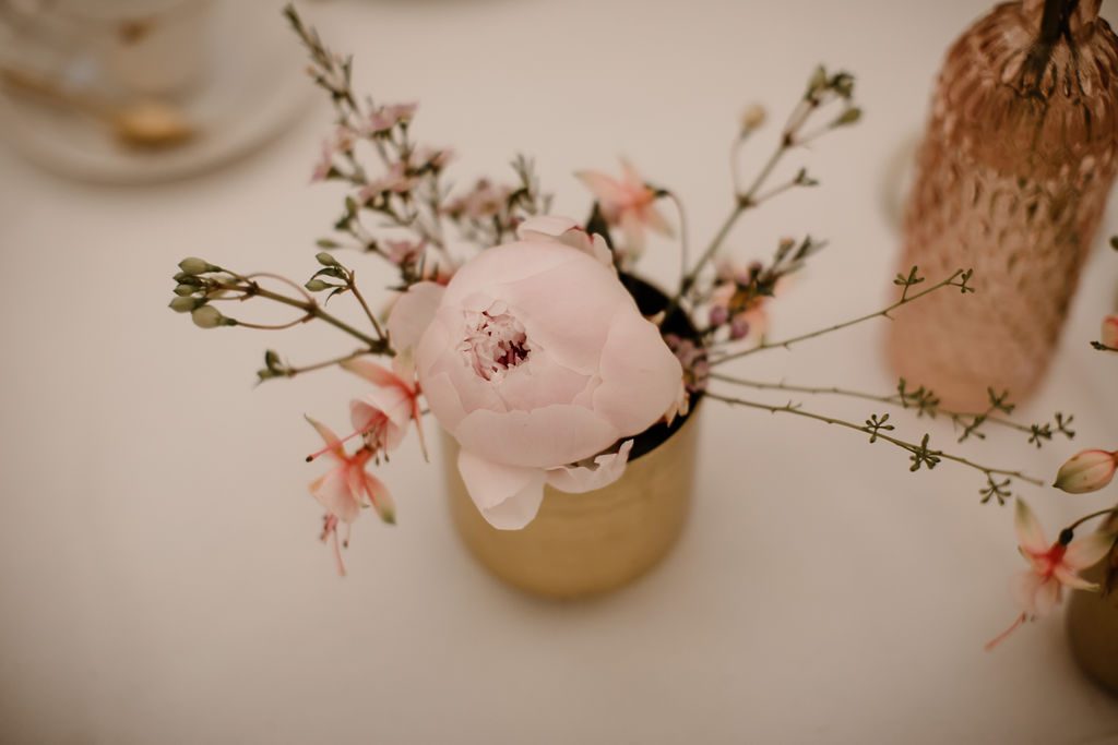 Wir lassen Braut und Bräutigam an einer Kaffeetafel Platz nehmen, die mit feinstem Porzellan eingedeckt ist, aber verstreut aufgestellte, moderne Glas- und Goldgefäße mit Pfingstrosen, Waxflower und Fuchsien lassen alles leicht und locker erscheinen.