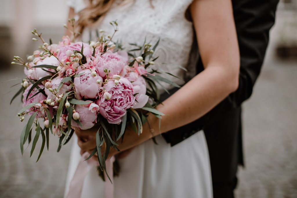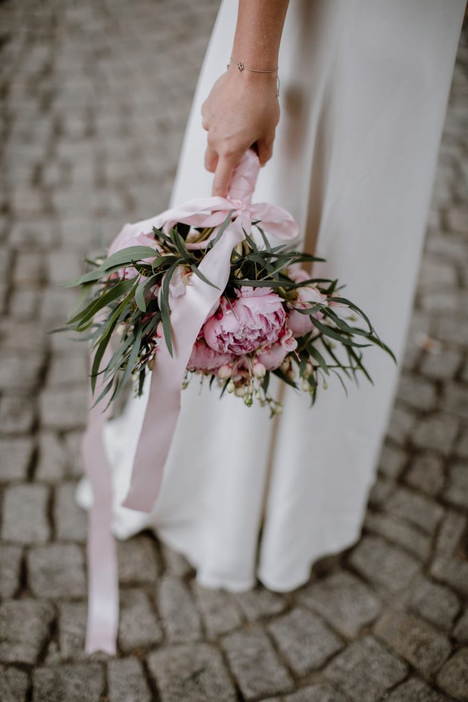 Im Brautstrauß habe ich meine Liebe zu Pfingstrosen ausgelebt und sie mit zartrosa, duftigen Fuchsienblüten kombiniert.