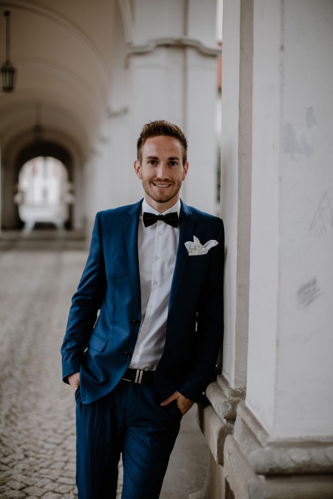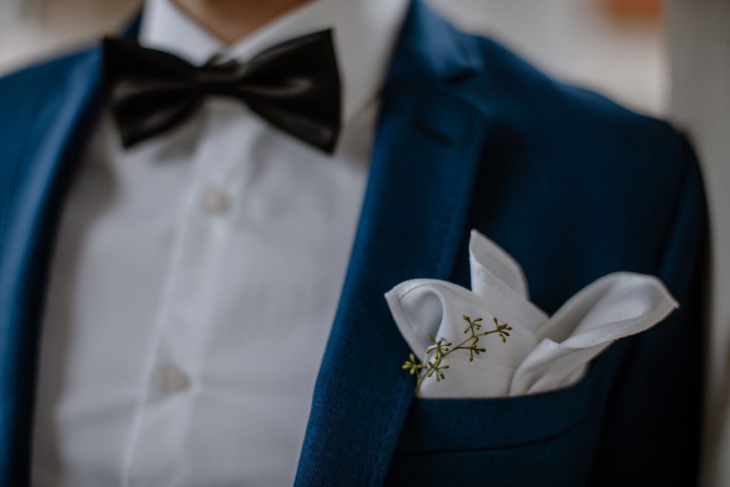Der Bräutigam besticht im chicen, blauen Anzug mit Mascherl oder in braun mit Krawatte.